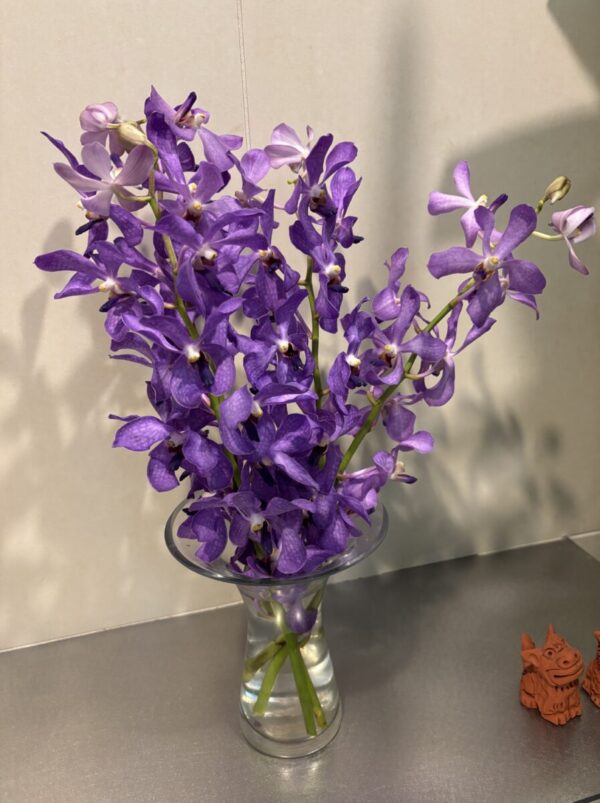モカラは3種類のランを交配したもので、人工的に育種されたお花です。花色もカラフルなものが多く、この花束も鮮やかな紫ですね。