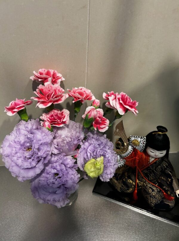 淡い紫のトルコキキョウと、縁取りが印象的なピンクのスプレーカーネーションの組み合わせが、春らしい華やかさを感じさせてくれますね。